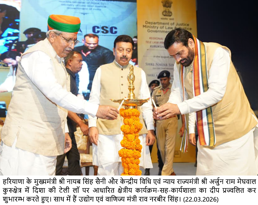 मुख्यमंत्री नायब सिंह सैनी रविवार को कुरुक्षेत्र विश्वविद्यालय में क्षेत्रीय दिशा कार्यशाला में शिरकत कर रहे थे। कार्यक्रम में केंद्रीय विधि एवं न्याय राज्य मंत्री अर्जुन राम मेघवाल, हरियाणा के कैबिनेट मंत्री राव नरबीर सिंह, न्याय विभाग के सेक्रेटरी नीरज वर्मा, ज्वाइंट सेक्रेटरी सुरेश कुमार भी मौजूद थे। कानून एवं न्याय मंत्रालय के न्याय विभाग की तरफ से दिशा (डिज़ाइनिंग इनोवेटिव सॉल्यूशंस फॉर होलिस्टिक एक्सेस टू जस्टिस) कार्यशाला का आयोजन किया गया है। इसमें अलग अलग विश्वविद्यालयों से लॉ संकाय के स्टूडेंट्स और वकील सहित प्रबुद्धजन भी शामिल हुए।