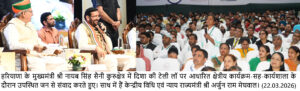 चंडीगढ़, 22 मार्च : हरियाणा के मुख्यमंत्री नायब सिंह सैनी ने कहा कि प्रधानमंत्री नरेंद्र मोदी ने ‘डिजिटल इंडिया’ और ‘विकसित भारत’ का जो विजन दिया है, उसमें समावेशी विकास और सुशासन की स्पष्ट झलक दिखाई देती है। हरियाणा सरकार इस विजन के साथ पूरी तरह से प्रतिबद्ध है। सरकार मानती हैं कि जब तक समाज का हर वर्ग अपने अधिकारों के प्रति जागरूक और न्याय प्राप्ति के प्रति आश्वस्त नहीं होगा, तब तक वास्तविक विकास संभव नहीं है।