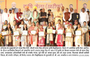 उन्होंने कृषि मेले में 42 प्रगतिशील किसानों को सम्मानित किया, जिनमें 21 महिला किसान भी शामिल रहीं। मुख्यमंत्री ने उन्हें प्रदेश की प्रगति का प्रेरणास्रोत बताया। उन्होंने कहा कि हरियाणा आज देश के खाद्यान्न भंडार में दूसरा सबसे बड़ा योगदान देने वाला राज्य बन चुका है। यह किसानों की मेहनत, वैज्ञानिकों के शोध और सरकार की नीतियों का परिणाम है।