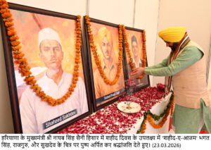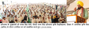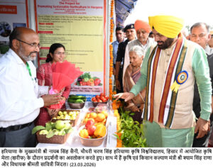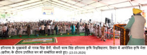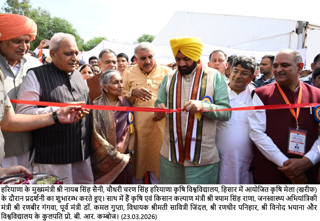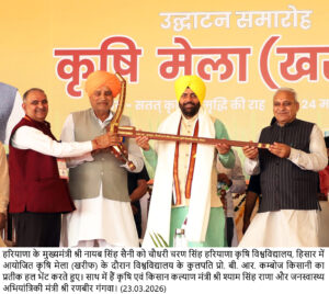 चंडीगढ़, 23 मार्च : हरियाणा के मुख्यमंत्री नायब सिंह सैनी ने कहा कि हिसार की मिट्टी मेहनत, पशुधन समृद्धि और वीर सैनिकों की कुर्बानियों की गवाही देती है। राखीगढ़ी हमारी प्राचीन सभ्यता का गौरव है, जबकि अग्रोहा की धरती महाराजा अग्रसेन के सामाजिक समरसता और व्यापारिक वैभव की कहानी कहती है। सोमवार को चौधरी चरण सिंह हरियाणा कृषि विश्वविद्यालय में आयोजित खरीफ कृषि मेला-2026 का शुभारंभ करते हुए मुख्यमंत्री ने किसानों, वैज्ञानिकों और नवाचार को एक मंच पर लाने की पहल को सराहा। उन्होंने कृषि मेले में पहुंचने पर सर्वप्रथम शहीदी दिवस के अवसर पर अमर शहीद भगत सिंह, राजगुरु व सुखदेव की प्रतिमाओं पर श्रद्धासुमन अर्पित किए।