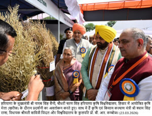 उन्होंने कहा कि चौधरी चरण सिंह हरियाणा कृषि विश्वविद्यालय द्वारा आयोजित यह मेला किसानों की मेहनत और वैज्ञानिकों की दूरदृष्टि का प्रतीक है। विश्वविद्यालय ने उन्नत बीज, जल संरक्षण, मृदा स्वास्थ्य और जलवायु-स्मार्ट कृषि के क्षेत्र में महत्वपूर्ण कार्य किए हैं। मुख्यमंत्री ने कहा कि आज भिवानी जिले के गोकुलपुरा में 64 एकड़ में 11.67 करोड़ रुपये की लागत से बने पोषक अनाज अनुसंधान केंद्र का भी उद्घाटन किया गया है।