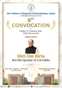 इंदौर। मध्य प्रदेश के इंदौर स्थित श्री वैष्णव विद्यापीठ विश्वविद्यालय में शुक्रवार को 8वां दीक्षांत समारोह अत्यंत भव्य और गरिमामय वातावरण में आयोजित किया गया। इस विशेष अवसर पर लोकसभा अध्यक्ष ओम बिरला मुख्य अतिथि के रूप में उपस्थित रहे। समारोह में विश्वविद्यालय के वरिष्ठ पदाधिकारी, शिक्षकगण, अभिभावक और बड़ी संख्या में विद्यार्थियों ने भाग लिया।
