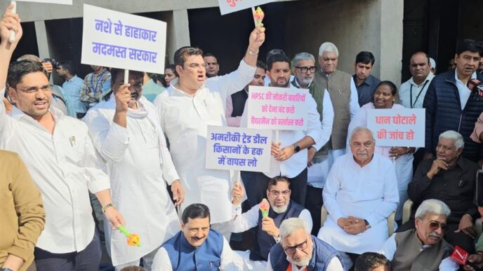मनरेगा, बाहरियों को नौकरी, बेरोजगारी, मुआवजा, टोल वसूली समेत दर्जनों मुद्दों पर नारेबाजी| कांग्रेस विधायकों ने हरियाणा विधानसभा का किया घेराव, भूपेंद्र सिंह हुड्डा के नेतृत्व में बीजेपी सरकार के खिलाफ जोरदार प्रदर्शन February 25, 2026
