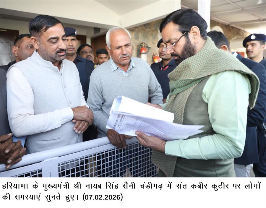 हरियाणा के मुख्यमंत्री नायब सिंह सैनी चंडीगढ़ में संत कबीर कुटीर आवास पर समस्याएं सुनते हुए February 7, 2026