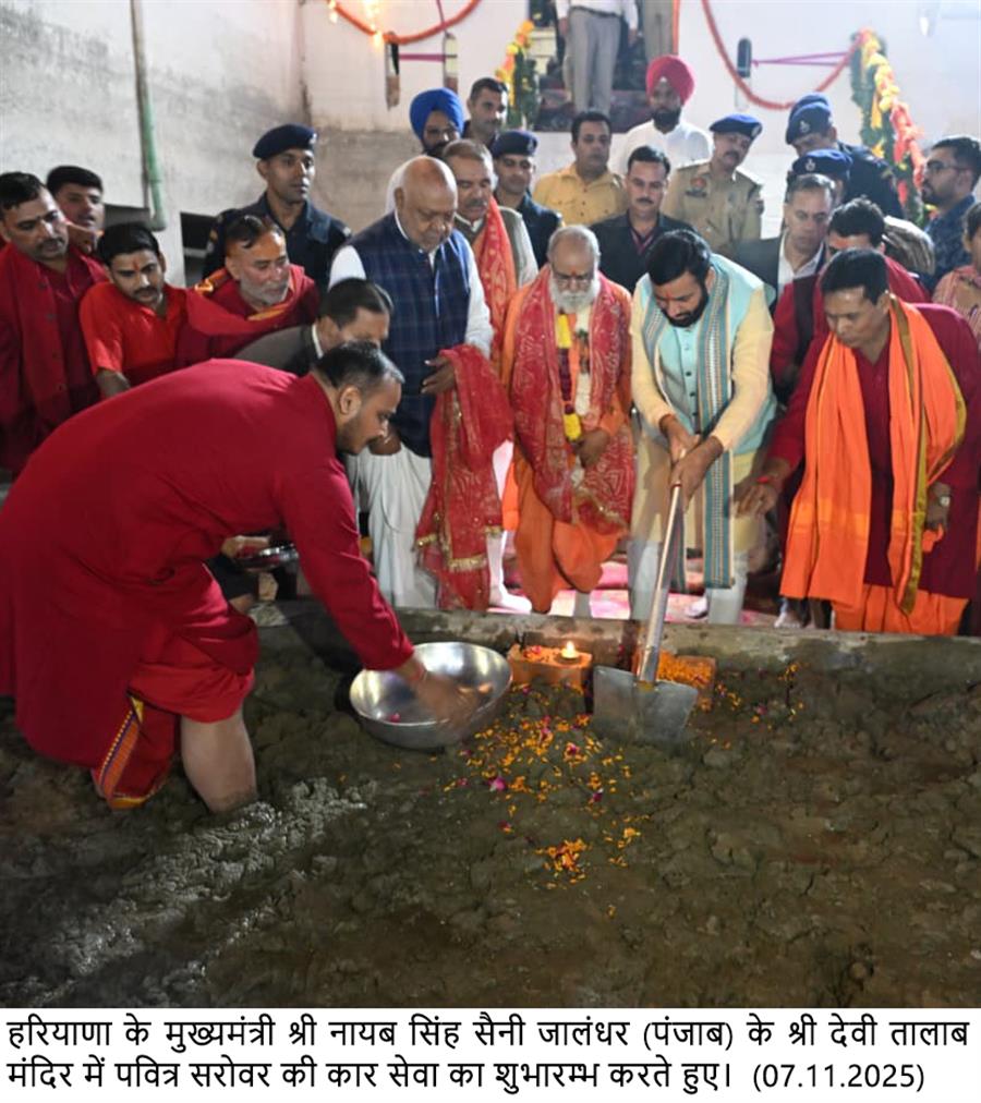 हरियाणा के मुख्यमंत्री श्री नायब सिंह सैनी जालंधर (पंजाब) के श्री देवी तालाब मंदिर में पवित्र सरोवर की कार सेवा का शुभारम्भ करते हुए। November 7, 2025