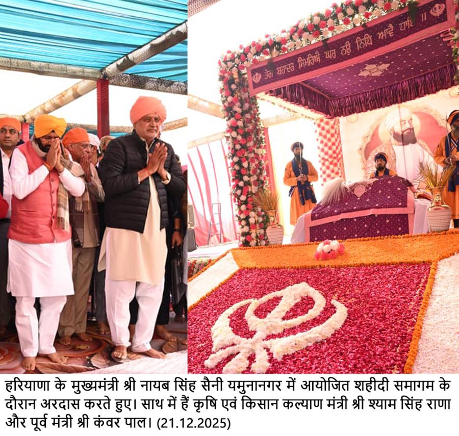 यमुनानगर में बन रहे मेडिकल कॉलेज का नाम हिन्द की चादर श्री गुरु तेग बहादुर जी के नाम पर रखा : नायब सिंह सैनी December 21, 2025