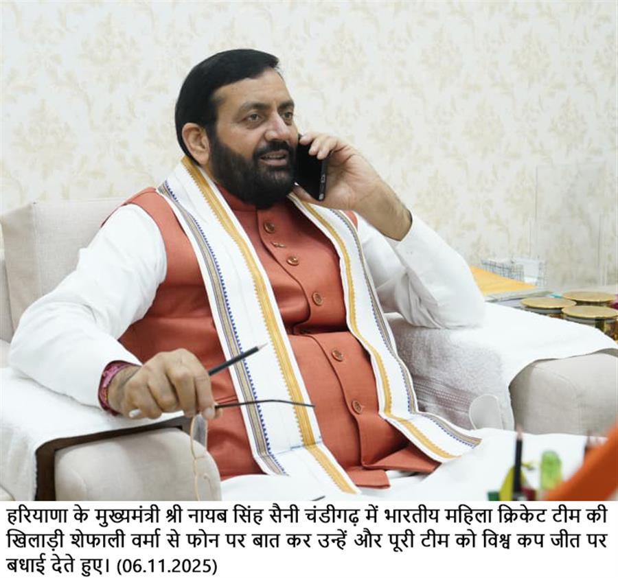 हरियाणा के मुख्यमंत्री श्री नायब सिंह सैनी चंडीगढ़ में भारतीय महिला क्रिकेट टीम की खिलाड़ी शेफाली वर्मा से फोन पर बात कर उन्हें और पूरी टीम को विश्व कप जीत पर बधाई देते हुए। November 6, 2025
