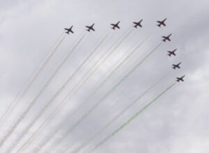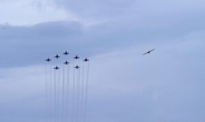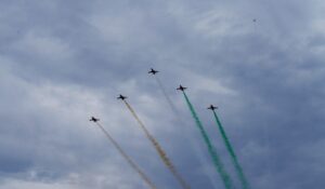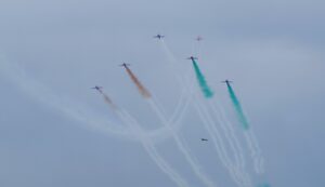 सूर्यकिरण एरोबैटिक टीम (SKAT) ने तेजस और युवा फॉर्मेशन, बैरल रोल, हाई स्पीड क्रॉस, डीएनए, हार्ट तथा लूप जैसे अद्भुत हवाई करतबों का प्रदर्शन किया, जो उनके बेहतरीन समन्वय और उड़ान कौशल का प्रतीक थे। तिरंगे रंगों से सजी धुएं की लहरों ने चंडीगढ़ के आसमान को देशभक्ति के रंगों में रंग दिया और दर्शकों की जोरदार तालियां बटोरीं। फॉर्मेशन लीडर ने रेडियो के माध्यम से ट्राईसिटी के दर्शकों के लिए “ब्लू स्काई और हैप्पी लैंडिंग्स” का संदेश भी प्रसारित किया।