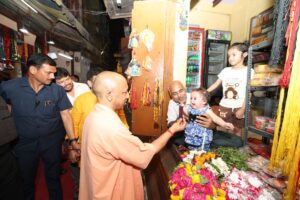 काल भैरव मंदिर से दर्शन कर निकलते समय माला-फूल बेचने वाले की दुकान पर बैठी दुकानदार की छोटी बिटिया को देख मुख्यमंत्री ने उसे दुलारते हुए पुचकारा।