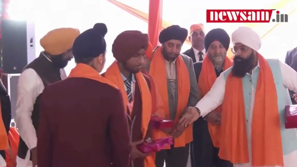 कीर्तन समागम में मुख्यमंत्री कलाकारों व बच्चों को उनकी उपलब्धियों के लिए सम्मानित करते हुए