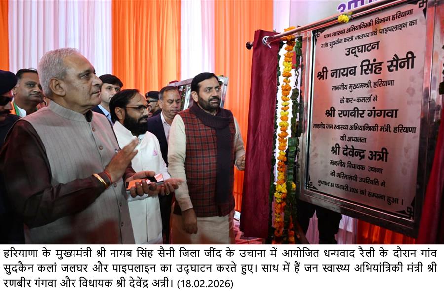 चंडीगढ़, 18 फरवरी : हरियाणा के मुख्यमंत्री नायब सिंह सैनी ने आज उचाना में आयोजित धन्यवाद रैली के दौरान विधानसभा क्षेत्र के विकास को नई गति देते हुए 103 करोड़ 30 लाख 84 हजार रुपये की विभिन्न परियोजनाओं का उद्घाटन एवं शिलान्यास किया। प्रदेश सरकार का उद्देश्य हर क्षेत्र में बुनियादी सुविधाओं को मजबूत कर आमजन के जीवन को सरल और बेहतर बनाना है।