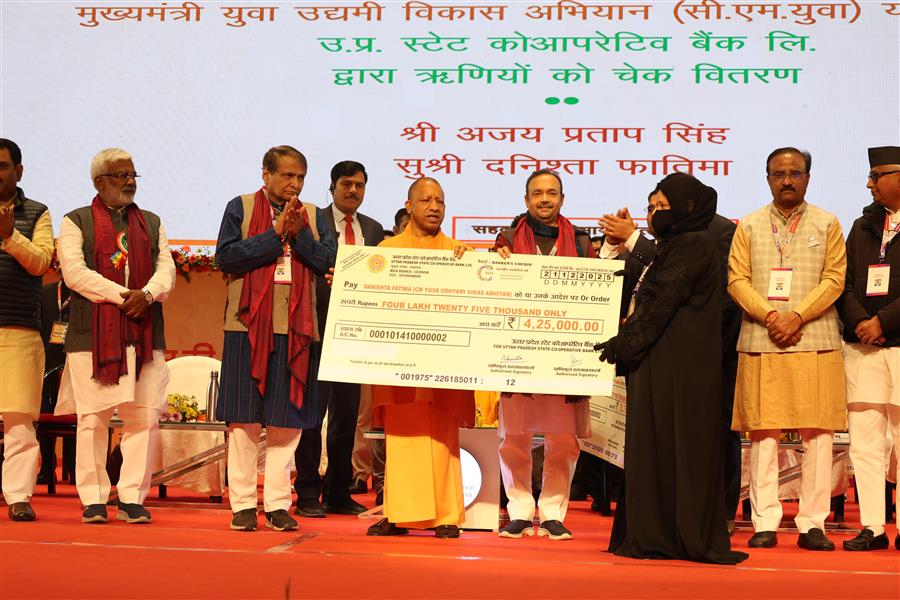 👉 यूपी स्टेट को-ऑपरेटिव बैंक लिमिटेड द्वारा सीएम युवा उद्यमी योजना के तहत अजय प्रताप सिंह को दनिश्ता फातिमा को पांच-पांच लाख ऋण का चेक दिया गया