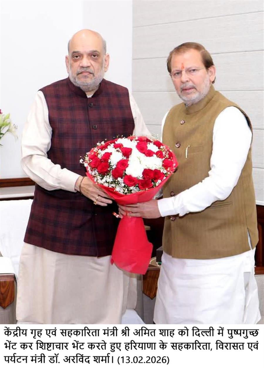 नई दिल्ली, 13 फरवरी : हरियाणा के सहकारिता, विरासत एवं पर्यटन मंत्री डॉ. अरविंद शर्मा ने आज लोकसभा सत्र के दौरान नई दिल्ली स्थित कार्यालय में केंद्रीय गृह एवं सहकारिता मंत्री अमित शाह से शिष्टाचार भेंट की।