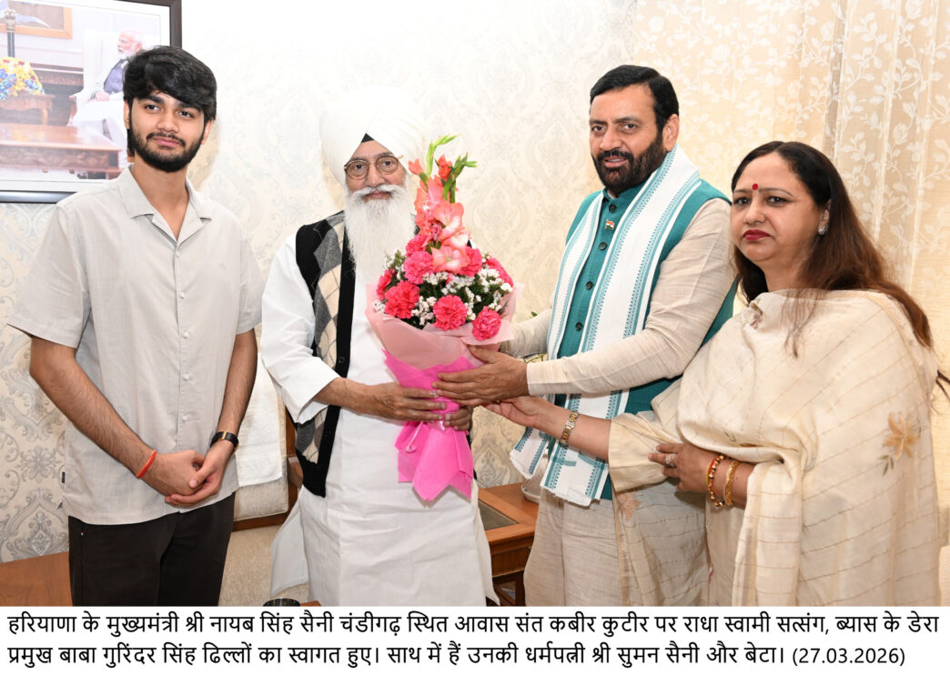 चंडीगढ़, 27 मार्च। हरियाणा के मुख्यमंत्री नायब सिंह सैनी से डेरा ब्यास प्रमुख बाबा गुरिंदर सिंह ढिल्लों की शिष्टाचार भेंट हुई।