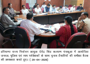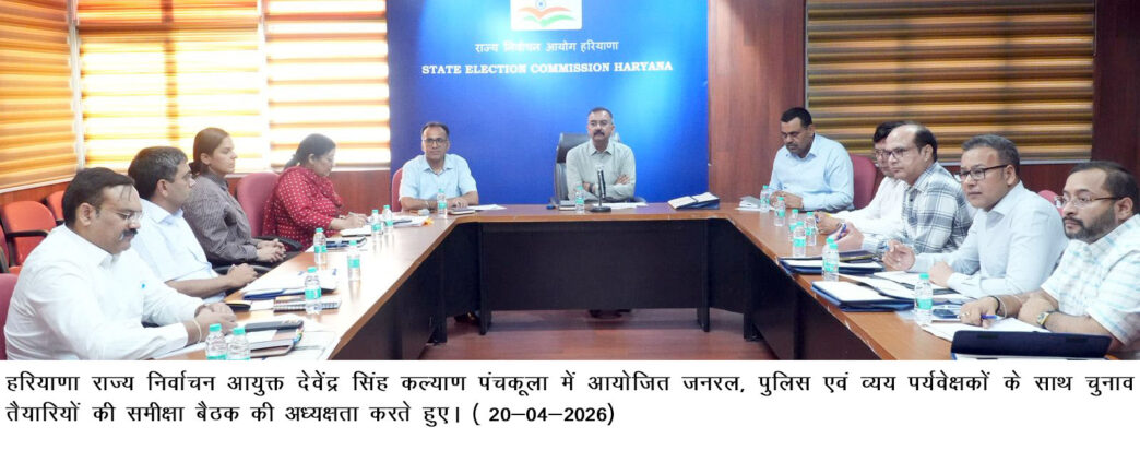 चंडीगढ़, 20 अप्रैल। हरियाणा राज्य निर्वाचन आयुक्त देवेंद्र सिंह कल्याण ने आज हरियाणा राज्य निर्वाचन आयोग, पंचकुला में आयोजित बैठक में सामान्य, पुलिस एवं व्यय (Expenditure) पर्यवेक्षकों के साथ चुनाव तैयारियों की समीक्षा करते हुए विस्तृत दिशा-निर्देश जारी किए। उन्होंने कहा कि नगर निकाय एवं पंचायती राज संस्थाओं के चुनाव स्वतंत्र, निष्पक्ष, पारदर्शी और शांतिपूर्ण ढंग से सम्पन्न कराना सर्वोच्च प्राथमिकता है।