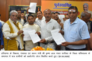 चंड़ीगढ़, 7 मार्च : हरियाणा के विकास, पंचायत एवं खनन मंत्री कृष्ण लाल पंवार ने आज पानीपत के जिला सचिवालय के सभागार में गांव खुखराना के पुनर्स्थापन की दिशा में बड़ा कदम उठाते हुए 445 पात्र ग्रामीणों को अलॉटमेंट लेटर वितरित किए।