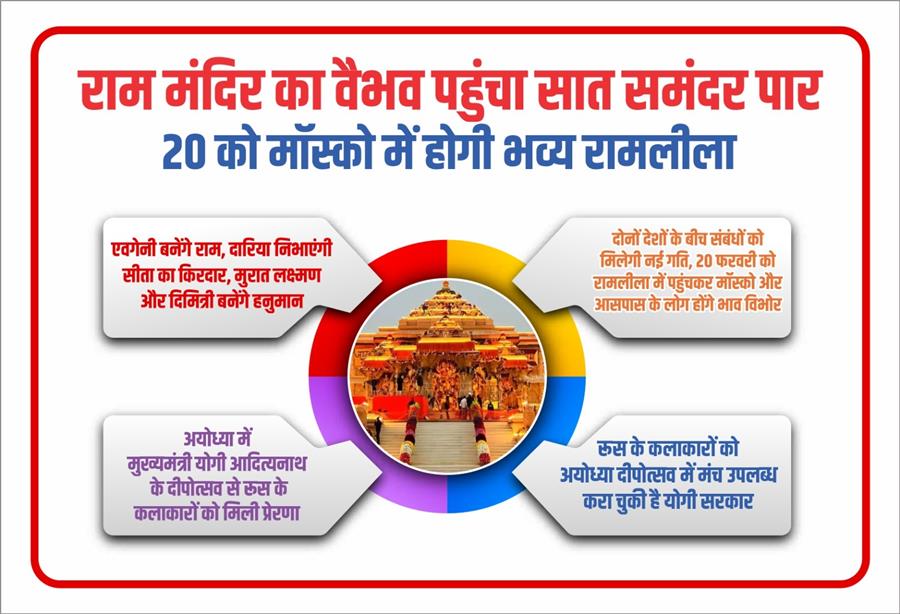लखनऊ, 15 फरवरी : अयोध्या में मुख्यमंत्री योगी आदित्यनाथ के नेतृत्व में राममंदिर से जुड़े विकास कार्यों और दीपोत्सव समेत किए जा रहे अभूतपूर्व आयोजनों की ख्याति अब सात समंदर पार तक पहुंच रही है। योगी सरकार के सांस्कृतिक विजन और अयोध्या में हुए आध्यात्मिक नवजागरण से प्रेरित होकर रूस की राजधानी मॉस्को में 20 फरवरी को भव्य रामलीला का आयोजन होगा। यह रामलीला अयोध्या में विगत दिनों हुए दीपोत्सव से प्रेरणा लेकर दिव्य और भव्य रूप में आयोजित की जा रही है। इसे भारत-रूस सांस्कृतिक संबंधों के नए अध्याय के रूप में देखा जा रहा है।