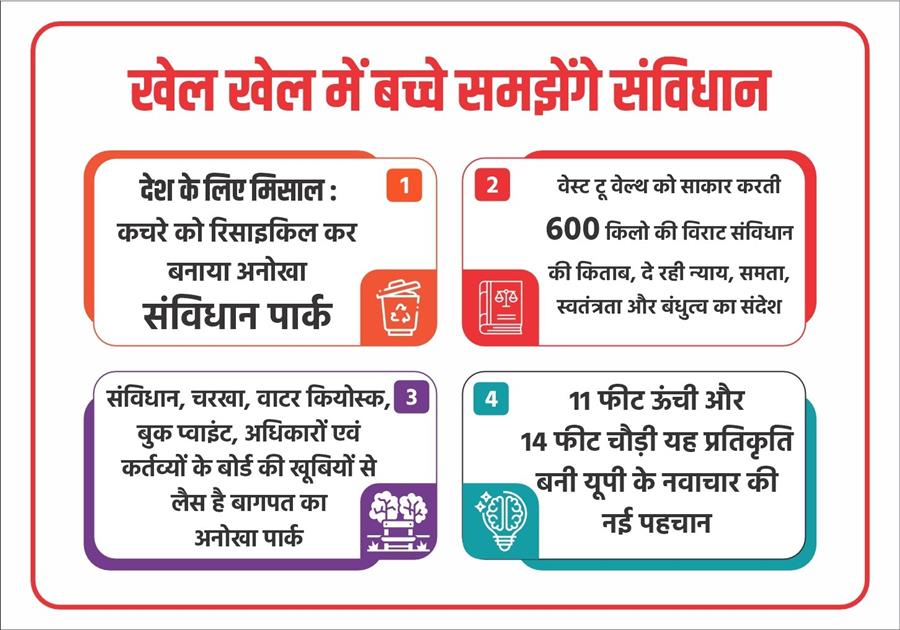 यह पार्क सिर्फ हरियाली या टहलने की जगह नहीं, बल्कि एक ओपन क्लासरूम और स्ट्रीट लाइब्रेरी के रूप में विकसित किया गया है। न्याय, समता, स्वतंत्रता और बंधुत्व जैसे संविधान के मूल आदर्शों को प्रतीकों, बोर्डों और संरचनाओं के माध्यम से इस तरह प्रस्तुत किया गया है कि हर आयु वर्ग का व्यक्ति सहजता से उनसे जुड़ सके। बच्चों के लिए यह पार्क सीखने का आनंददायक माध्यम बन गया है, जहां पढ़ाई बोझ नहीं, अनुभव बन जाती है। संविधान पार्क की सबसे बड़ी विशेषता यहां स्थापित 600 किलोग्राम की संविधान की किताब की विराट प्रतिकृति है। 11 फीट ऊंची और 14 फीट चौड़ी यह प्रतिकृति न केवल आकार में भव्य है, बल्कि अपने संदेश में भी अत्यंत प्रभावशाली है। संविधान की मूल प्रस्तावना की प्रतिकृति बड़ौत नगर पालिका में स्थापित की गई है। इसका लोकार्पण राज्य मंत्री केपी मलिक और जिलाधिकारी अस्मिता लाल ने किया है।