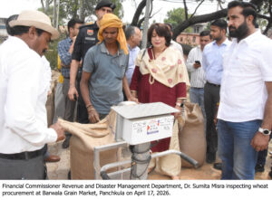 पंचकूला, 17 अप्रैल। हरियाणा के राजस्व एवं आपदा प्रबंधन विभाग की वित्तायुक्त डॉ. सुमिता मिश्रा ने आज रबी सीजन 2026–27 के तहत गेहूं खरीद और उठान (लिफ्टिंग) कार्यों की समीक्षा के लिए बरवाला अनाज मंडी का निरीक्षण किया। इस दौरान उन्होंने मंडी में किसानों और आढ़तियों के लिए उपलब्ध सुविधाओं का भी विस्तृत आकलन किया।