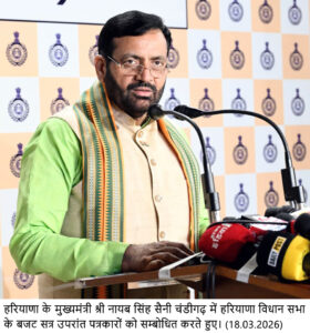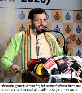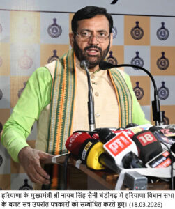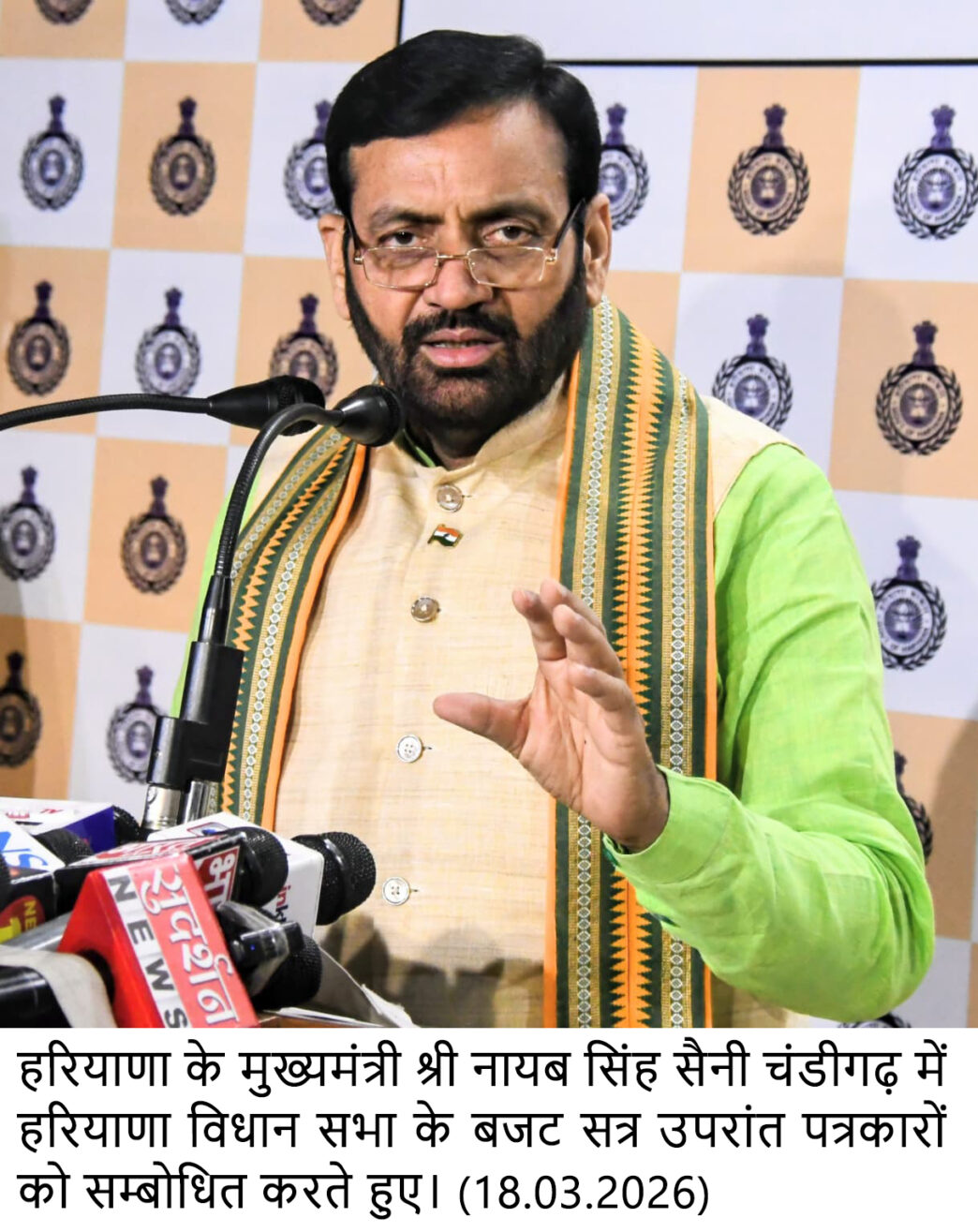चंडीगढ़, 18 मार्च : हरियाणा के मुख्यमंत्री नायब सिंह सैनी ने बजट सत्र 2026-27 की समाप्ति के उपरांत पत्रकारों को संबोधित करते हुए कहा कि यह सत्र 20 फरवरी को माननीय राज्यपाल के अभिभाषण से प्रारंभ होकर सफलतापूर्वक संपन्न हुआ। उन्होंने बताया कि कुल 13 दिनों तक चले इस सत्र में 13 बैठकें आयोजित हुईं, जिनमें लगभग 55 घंटे सकारात्मक और सार्थक चर्चा हुई।