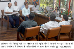 चंडीगढ़, 20 अप्रैल। हरियाणा की सिंचाई एवं जल संसाधन मंत्री श्रुति चौधरी ने आगामी मानसून सीजन को ध्यान में रखते हुए विभागीय अधिकारियों के साथ बाढ़ प्रबंधन को लेकर एक उच्च स्तरीय समीक्षा बैठक की। बैठक में संभावित बाढ़ की स्थिति से निपटने के लिए समय रहते सभी आवश्यक तैयारियां सुनिश्चित करने के निर्देश दिए गए।