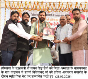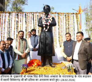 मुख्यमंत्री ने शनिवार को अंबाला जिले के गांव कड़ासन में स्वामी विवेकानंद की प्रतिमा के अनावरण करने उपरांत कहा कि स्वामी विवेकानंद केवल एक संत नहीं, बल्कि भारत की सोई हुई राष्ट्रीय चेतना को जगाने वाले युगपुरुष थे। उनकी प्रतिमा केवल पत्थर की मूर्ति नहीं, बल्कि आने वाली पीढ़ियों के लिए प्रेरणा, आत्मविश्वास और राष्ट्रभक्ति का जीवंत प्रतीक है।