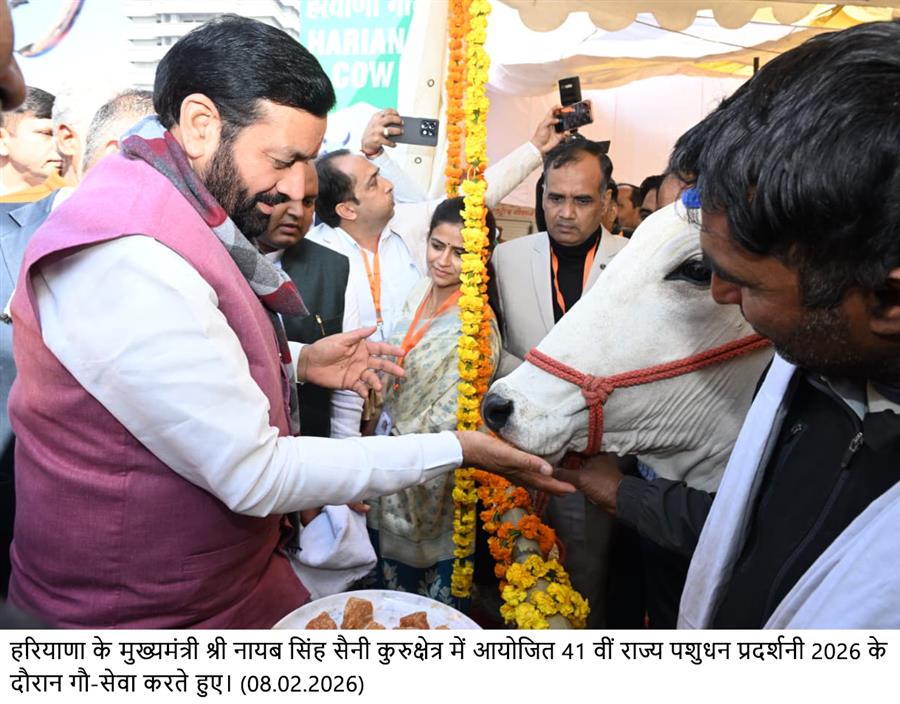 मुख्यमंत्री नायब सिंह सैनी आज कुरुक्षेत्र में आयोजित 41वीं राज्य स्तरीय पशुधन प्रदर्शनी समारोह के तीसरे दिन बतौर मुख्य अतिथि संबोधित कर रहे थे। इस दौरान कैबिनेट मंत्री श्याम सिंह राणा, सांसद नवीन जिंदल, पूर्व मंत्री सुभाष सुधा, चेयरमैन धर्मवीर मिर्जापुर भी साथ रहे। मुख्यमंत्री ने देशी गाय को गुड़ खिलाकर पूजा अर्चना भी की।