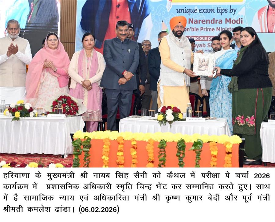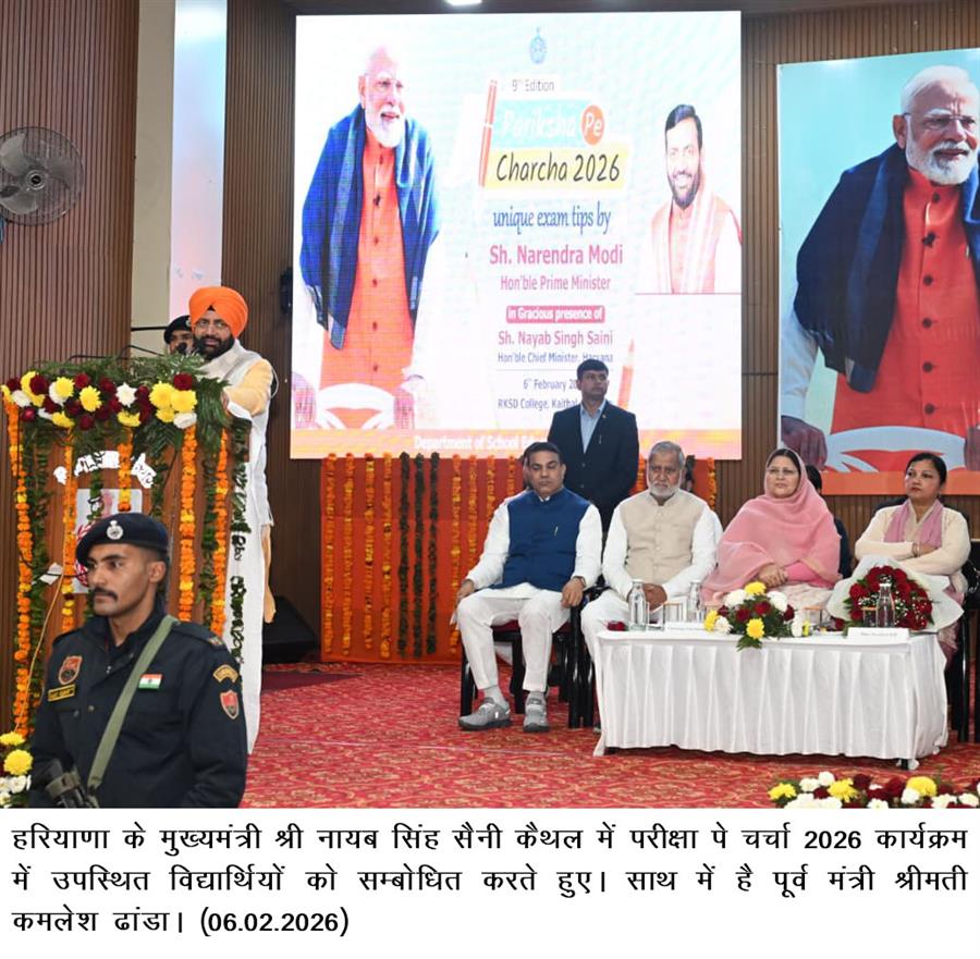 चंडीगढ़, 6 फरवरी : हरियाणा के मुख्यमंत्री नायब सिंह सैनी ने शुक्रवार को शिक्षा निदेशालय द्वारा आरकेएसडी कॉलेज कैथल के सभागार में आयोजित परीक्षा पे चर्चा कार्यक्रम में बतौर मुख्य अतिथि शिरकत की। उन्होंने विद्यार्थियों के साथ प्रधानमंत्री नरेंद्र मोदी के एग्जाम वॉरियर्स विशेष एपिसोड के लाइव प्रसारण को देखा। इसके उपरांत मुख्यमंत्री ने कक्षा 9वीं से 12वीं के विद्यार्थियों, शिक्षकों और अभिभावकों को संबोधित करते हुए उनका मनोबल बढ़ाया। मुख्यमंत्री ने बच्चों को परीक्षा का दबाव न लेने का आह्वान करते हुए कहा कि परीक्षा आपकी पहचान नहीं बल्कि परीक्षा के लिए किए गए आपके प्रयास, मेहनत व सोच ही आपकी असली पहचान है।