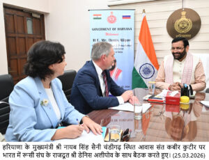 चंडीगढ़, 25 मार्च। हरियाणा के मुख्यमंत्री नायब सिंह सैनी ने बुधवार को चंडीगढ़ स्थित अपने आवास संत कबीर कुटीर में भारत में रूसी संघ के राजदूत डेनिस अलीपोव से मुलाकात की। इस दौरान दोनों पक्षों के बीच द्विपक्षीय सहयोग को और सुदृढ़ करने तथा नए सहयोग के अवसरों की तलाश को लेकर विस्तृत चर्चा हुई।
