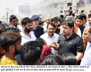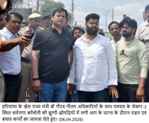 चंडीगढ़, 6 अप्रैल। जिला प्रशासन और पुलिस प्रशासन की तत्परता और मुस्तैदी से आज पलवल के सेक्टर-2 स्थित धर्मनगर कॉलोनी की झुग्गी-झोपड़ियों में लगी आग पर जल्द काबू पा लिया गया। हरियाणा के खेल राज्य मंत्री गौरव गौतम, उपायुक्त डॉ. हरीश कुमार वशिष्ठ तथा पुलिस अधीक्षक नितीश अग्रवाल घटना की सूचना मिलते ही तुरंत मौके पर पहुंचे और राहत एवं बचाव कार्यों का जायजा लिया।