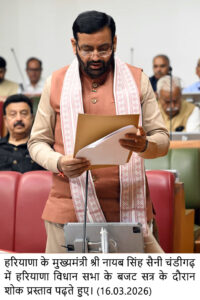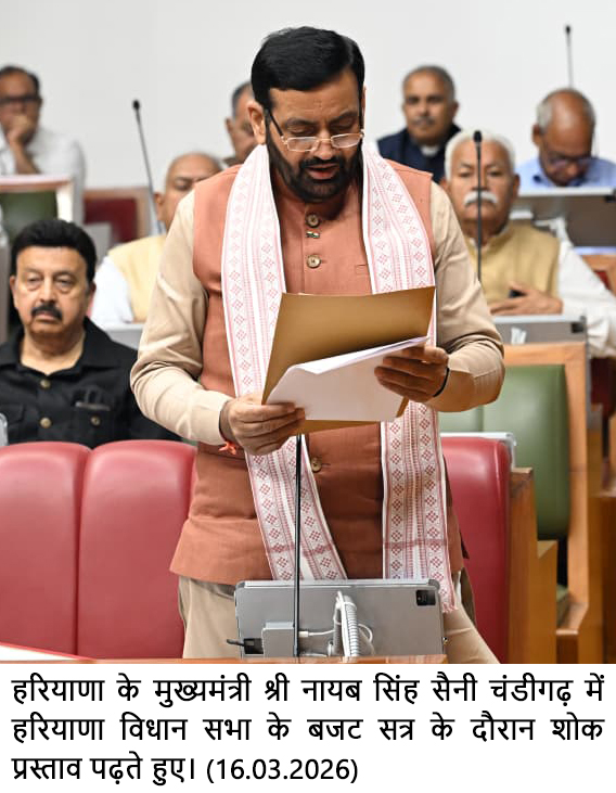 चंडीगढ़, 16 मार्च : हरियाणा के मुख्यमंत्री नायब सिंह सैनी ने सोमवार को हरियाणा विधानसभा में चल रहे बजट सत्र के दौरान सदन में शोक प्रस्ताव पढ़ते हुए हरियाणा विधानसभा के अध्यक्ष हरविंद्र कल्याण की माता प्रेम कौर कल्याण के निधन तथा गुरुग्राम में एक कंस्ट्रक्शन साइट पर हुए हादसे में 7 लोगों की मृत्यु पर गहरा शोक व्यक्त किया। उन्होंने शोक-संतप्त परिवारों के प्रति अपनी संवेदना प्रकट की।