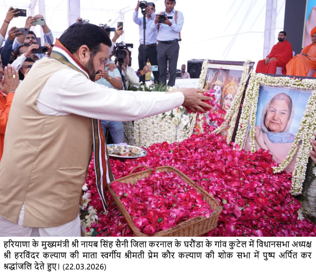 मुख्यमंत्री ने परमपिता परमात्मा से दिवंगत आत्मा को अपने श्री चरणों में स्थान देने और परिजनों को दुख सहने की शक्ति प्रदान करने की कामना की। बता दें कि मुख्यमंत्री रविवार को हरियाणा चुनाव आयोग के मुख्य आयुक्त देवेंद्र कल्याण एवं हरियाणा विधानसभा के अध्यक्ष हरविंद्र कल्याण कि माताजी स्वर्गीय प्रेम कौर कल्याण की स्मृति में आयोजित श्रद्धांजलि समारोह में शिरकत करते हुए उन्हें पुष्पांजलि अर्पित कर रहे थे।