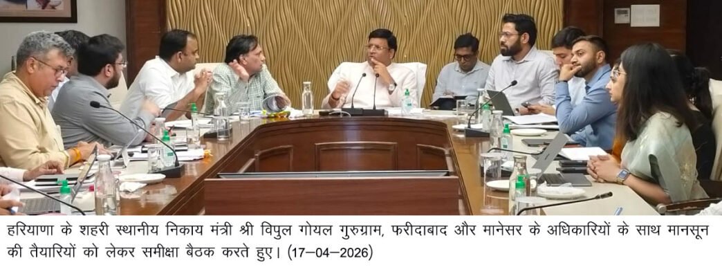 गुरुग्राम, 17 अप्रैल। हरियाणा के शहरी स्थानीय निकाय मंत्री विपुल गोयल ने गुरुग्राम स्थित लोक निर्माण विभाग विश्राम गृह में गुरुग्राम, फरीदाबाद और मानेसर के अधिकारियों के साथ मानसून तैयारियों को लेकर एक महत्वपूर्ण समीक्षा बैठक की। बैठक में उन्होंने अधिकारियों को स्पष्ट निर्देश दिए कि इस बार मानसून के दौरान कहीं भी जलभराव की स्थिति उत्पन्न न हो और नागरिकों को किसी प्रकार की असुविधा का सामना न करना पड़े।