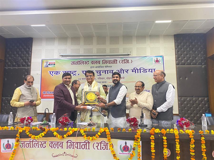 भिवानी में जर्नलिस्ट क्लब भिवानी द्वारा आयोजित एक राष्ट्र, एक चुनाव और मीडिया विषय पर आयोजित संगोष्ठी में बतौर मुख्य वक्ता पहुंचे भाजपा राष्ट्रीय सचिव औमप्रकाश धनखड़