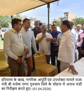 खाद्य, नागरिक आपूर्ति एवं उपभोक्ता मामले विभाग के मंत्री राजेश नागर बुधवार को गुरूग्राम जिला के सोहना अनाज मंडी का निरीक्षण करने उपरांत बोल रहे थे। इस दौरान उन्होंने आढ़तियों और किसानों से संवाद कर उनकी समस्याएं भी जानीं।