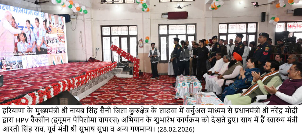 चंडीगढ़, 28 फरवरी : आत्म निर्भर भारत, स्वस्थ भारत के लक्ष्य को लेकर प्रधानमंत्री नरेंद्र मोदी ने राजस्थान के अजमेर से राष्ट्रव्यापी ह्यूमन पेपिलोमा वायरस (एच.पी.वी. ) वैक्सीनेशन अभियान की शुरुआत की, तो मुख्यमंत्री नायब सिंह सैनी ने हरियाणा में इस अभियान की शुरुआत प्रधानमंत्री का सीधा प्रसारण देखने के बाद की। मुख्यमंत्री ने प्रधानमंत्री के राष्ट्रव्यापी कार्यक्रम का सीधा प्रसारण देखा।