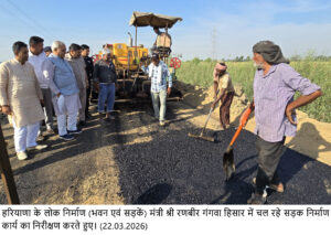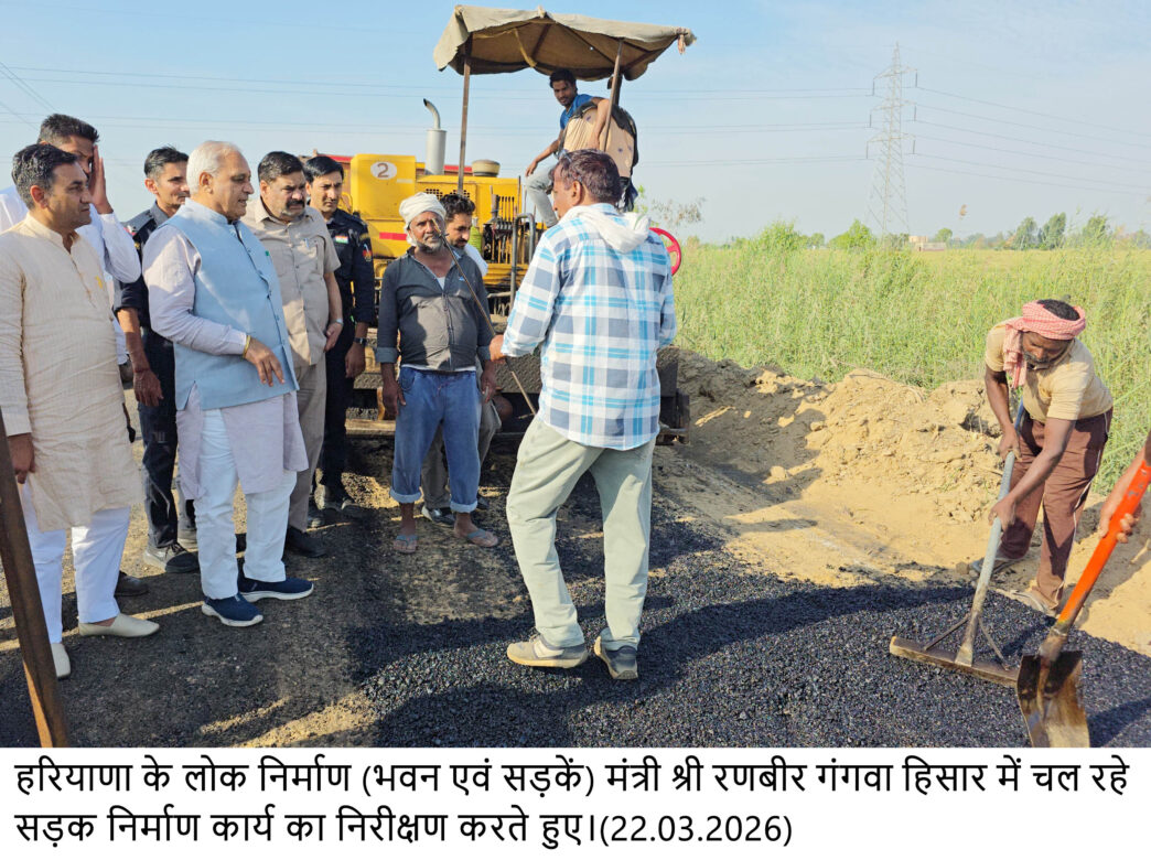 इसी क्रम में मंत्री ने आज हिसार जिला में खरकड़ी से खोखा तक चल रहे सड़क निर्माण कार्य का औचक निरीक्षण किया। निरीक्षण के दौरान उन्होंने मौके निर्माण सामग्री की गुणवत्ता की बारीकी से जांच की तथा संबंधित अधिकारियों और कार्यकारी एजेंसियों को आवश्यक दिशा-निर्देश दिए।