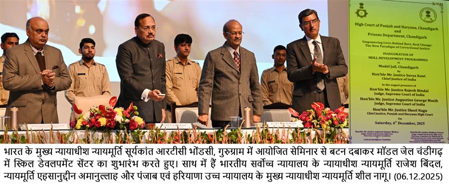 गुरुग्राम/ चंडीगढ़ : हरियाणा ने सुधारात्मक न्याय के क्षेत्र में एक ऐतिहासिक कदम उठाया, जब राज्य की विभिन्न जेलों में “एम्पावरिंग लाइव्स बिहाइंड बार्स”, रियल चेंज : दी न्यू पैराडिग्म ऑफ करेक्शनल जस्टिस परियोजना के अंतर्गत कौशल विकास केंद्रों, पॉलिटेक्निक डिप्लोमा पाठ्यक्रमों एवं आईटीआई-स्तरीय व्यावसायिक कार्यक्रमों का औपचारिक शुभारंभ किया गया। इन कार्यक्रमों का उद्घाटन भारत के मुख्य न्यायाधीश, माननीय न्यायमूर्ति सूर्यकांत द्वारा जिला जेल भोंडसी, गुरुग्राम में किया गया। इसी कार्यक्रम के दौरान माननीय मुख्य न्यायाधीश ने पंजाब, हरियाणा एवं यू.टी. चंडीगढ़ में एक माह चलने वाले राज्यव्यापी नशा-रोधी जागरूकता अभियान का भी शुभारंभ किया।
