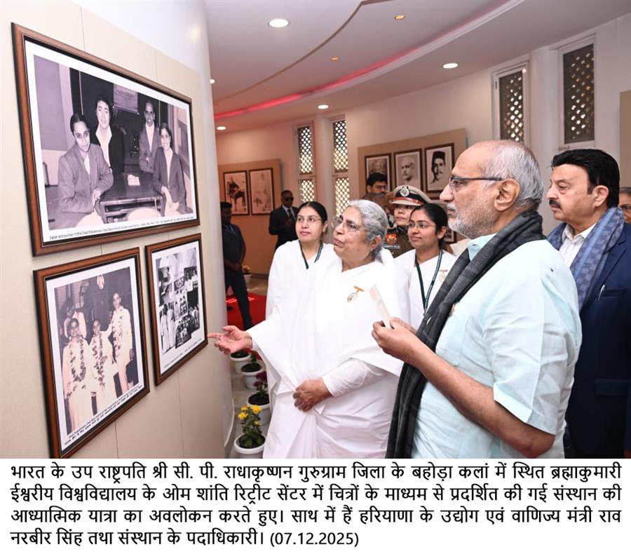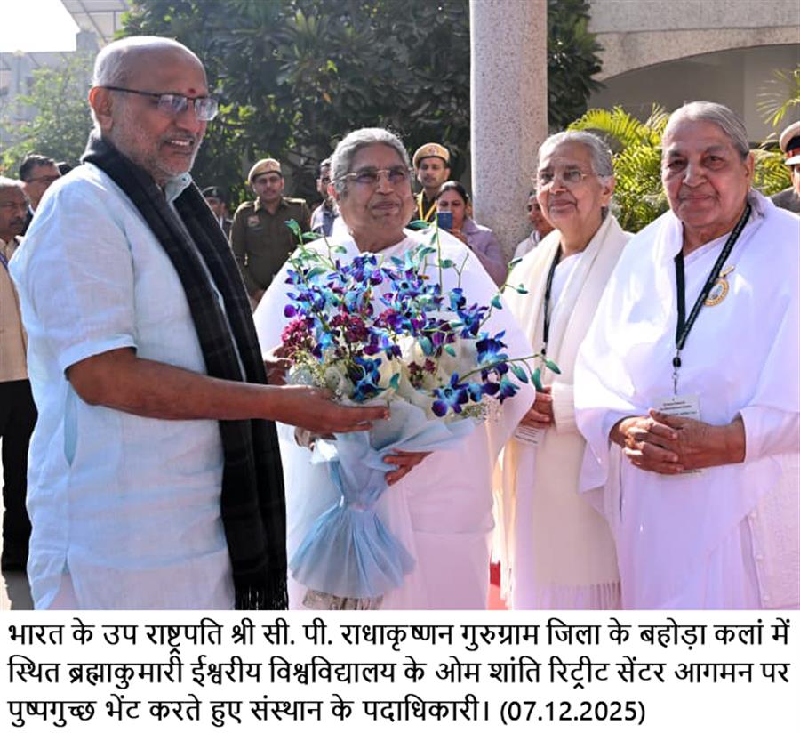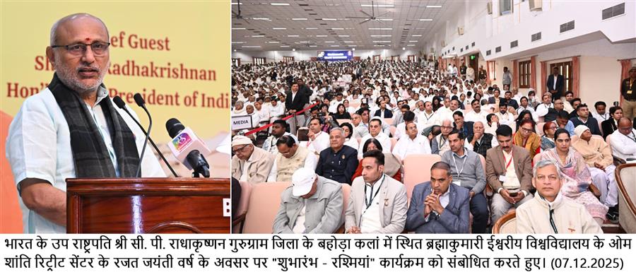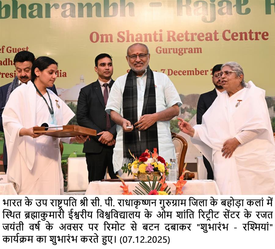 गुरुग्राम/चंडीगढ़, 07 दिसंबर : भारत के उप राष्ट्रपति एवं राज्यसभा के सभापति सी. पी. राधाकृष्णन ने कहा कि भारत के ऋषियों, मुनियों और तपस्वियों की साधना ने विश्व को ध्यान, आत्मबल और सत्य के मार्ग पर अग्रसर किया है। राजयोग, विपस्सना और तपस्या जैसी समृद्ध आध्यात्मिक परंपराएं आज भारत को विश्व गुरु बना रही है। उन्होंने कहा कि प्रधानमंत्री श्री नरेंद्र मोदी के विकसित भारत 2047 के संकल्प में भी यही आध्यात्मिक शक्ति राष्ट्र का मार्गदर्शन कर रही है।