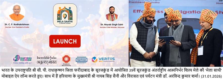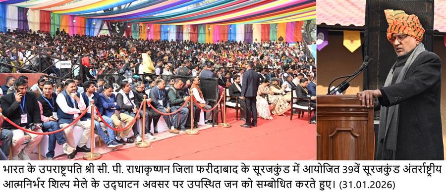 फरीदाबाद, 31 जनवरी। हरियाणा के सूरजकुंड में शनिवार को 39वें सूरजकुंड अंतर्राष्ट्रीय आत्मनिर्भर शिल्प मेला-2026 का भव्य आगाज हुआ, जो 15 फरवरी तक चलेगा। भारत के उपराष्ट्रपति सीपी राधाकृष्णन ने बतौर मुख्य अतिथि मेले का उद्घाटन किया। इस अवसर पर मुख्यमंत्री श्री नायब सिंह सैनी, केंद्रीय सहकारिता राज्य मंत्री कृष्ण पाल गुर्जर, मेले में सहयोगी देश मिस्र के प्रतिनिधि, हरियाणा के राजस्व एवं शहरी स्थानीय निकाय मंत्री विपुल गोयल, हरियाणा के खाद्य एवं नागरिक आपूर्ति राज्य मंत्री राजेश नागर, खेल राज्य मंत्री गौरव गौतम उपस्थित रहे।