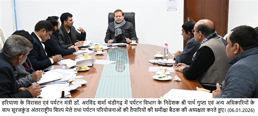 विरासत एवं पर्यटन मंत्री डॉ. अरविंद शर्मा ने पर्यटन विभाग के निदेशक पार्थ गुप्ता, महाप्रबंधक ममता शर्मा एवं वरिष्ठ अधिकारियों के साथ हरियाणा सिविल सचिवालय के पांचवें तल स्थित समिति कक्ष में समीक्षा बैठक की। बैठक में 31 जनवरी से 15 फरवरी तक आयोजित होने वाले 39वें सूरजकुंड अंतरराष्ट्रीय शिल्प मेले की तैयारियों और प्रदेश भर में चल रही पर्यटन विकास परियोजनाओं पर विस्तृत चर्चा हुई। विरासत एवं पर्यटन मंत्री डॉ. अरविंद शर्मा ने विभाग में मुख्यमंत्री घोषणाओं और बजट घोषणाओं पर भी फीडबैक लिया।