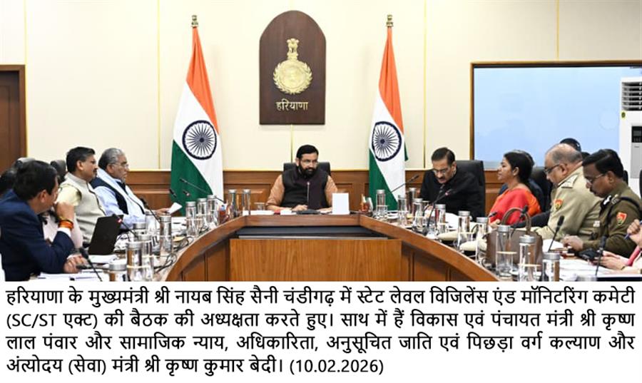 मुख्यमंत्री नायब सिंह सैनी चंडीगढ़ में अनुसूचित जाति अत्याचार अधिनियम 1989 और नागरिक अधिकार संरक्षण अधिनियम 1955 के प्रावधानों के कार्यान्वयन की समीक्षा हेतू राज्य स्तरीय सतर्कता एवं निगरानी समिति की बैठक की अध्यक्षता कर रहे थे। बैठक में विकास एंव पंचायत मंत्री कृष्ण लाल पंवार, सामाजिक न्याय एवं अधिकारिता मंत्री कृष्ण कुमार बेदी भी मौजूद रहे।