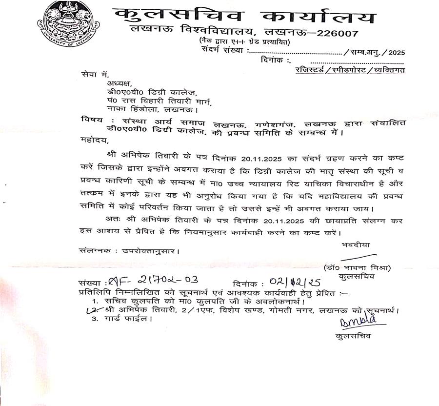 इस मामले में डीएवी इंटर कॉलेज के पूर्व मैनेजर अभिषेक तिवारी ने लखनऊ विश्वविद्यालय से शिकायत की थी। रजिस्ट्रार भावना मिश्रा ने बताया कि यदि महाविद्यालय की प्रबंध समिति में कोई भी परिवर्तन किया जाता है तो उसे अभिषेक तिवारी को भी अवगत कराया जाए। उन्होंने अभिषेक तिवारी के पत्र के मामले में नियमानुसार कार्रवाई करने का लिखित आश्वासन दिया है।