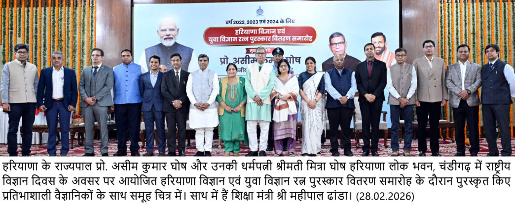 चंडीगढ़, 28 फरवरी : राष्ट्रीय विज्ञान दिवस के अवसर पर आज राज भवन हरियाणा में आयोजित राज्य स्तरीय समारोह में हरियाणा के राज्यपाल प्रोफेसर असीम कुमार घोष ने वर्ष 2022, 2023 और 2024 के लिए चयनित 11 प्रतिभाशाली वैज्ञानिकों को ‘हरियाणा विज्ञान रत्न’ और ‘हरियाणा युवा विज्ञान रत्न’ पुरस्कारों से सम्मानित किया। इस अवसर पर राज्यपाल ने कहा कि यह केवल सम्मान समारोह नहीं, बल्कि ज्ञान, नवाचार और विज्ञान की परिवर्तनकारी शक्ति में हमारे सामूहिक विश्वास का यादगार क्षण है। राज्यपाल ने सभी सम्मानित वैज्ञानिकों को बधाई देते हुए कहा कि उनकी उपलब्धियां न केवल हरियाणा बल्कि पूरे राष्ट्र के लिए गौरव का विषय हैं।