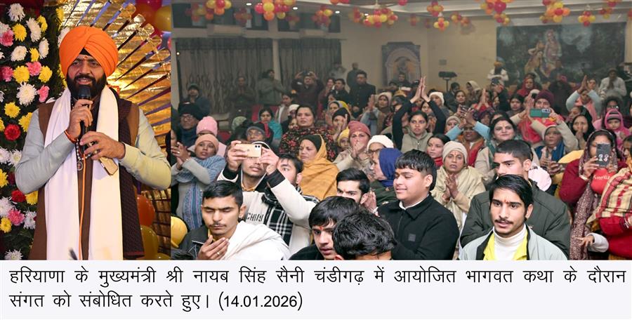 चंडीगढ़, 14 जनवरी : हरियाणा के मुख्यमंत्री नायब सिंह सैनी ने कहा कि श्रीमद्भागवत कथा जैसे आध्यात्मिक आयोजन समाज में नैतिक मूल्यों, सामाजिक सद्भाव और भारत की समृद्ध सांस्कृतिक विरासत को सुदृढ़ करने में महत्वपूर्ण भूमिका निभाते हैं। उन्होंने कहा कि इस प्रकार के धार्मिक कार्यक्रम समाज को सत्य, करुणा और धर्म के मार्ग पर चलने की प्रेरणा देते हैं।