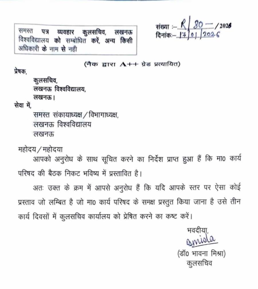 अब जब नए कुलपति आए हैं तो उन्होंने एक नोटिफिकेशन निकाल कर सभी दिन और विभाग अध्यक्ष से उनके लंबित कामों की सूची मांगी है यही नहीं विश्वविद्यालय की कुल सचिव डॉ भावना मिश्रा ने अपने द्वारा जारी पत्र में स्पष्ट किया है कि लखनऊ विश्वविद्यालय के कार्य परिषद अगले कुछ दिनों में प्रस्तावित है, ऐसे में जिनके काम कुलपति स्तर पर या कार्य परिषद स्तर पर लटके हुए हैं वह जल्द से जल्द प्रशासनिक कार्यालय को सूचित करें।