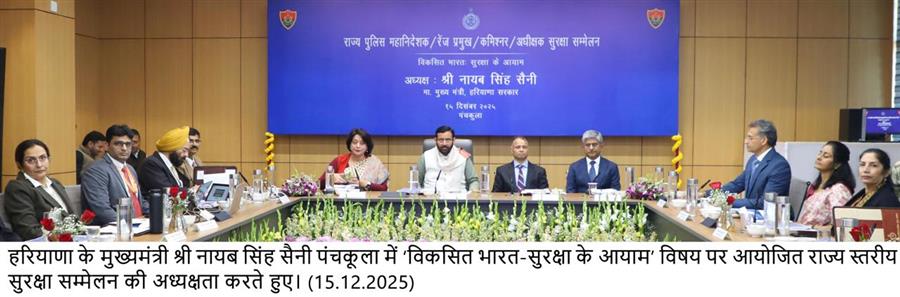 पंचकूला, 15 दिसंबर : हरियाणा के मुख्यमंत्री नायब सिंह सैनी ने कहा कि पुलिस का कार्य केवल अपराध पर नियंत्रण तक सीमित नही है बल्कि आम नागरिक के मन में सुरक्षा, भरोसे और न्याय का विश्वास पैदा करना भी है। यही विश्वास लोकतंत्र की सबसे बड़ी पूंजी है। वे आज पंचकूला में ‘विकसित भारत-सुरक्षा आयाम’ विषय पर आयोजित राज्य स्तरीय सुरक्षा सम्मेलन की अध्यक्षता कर रहे थे जिसमें अतिरिक्त पुलिस महानिदेशकों, पुलिस महानिरीक्षकों, कमिश्नरों, पुलिस अधीक्षकों, भारत सरकार के प्रतिनिधियों सहित कई अन्य वरिष्ठ अधिकारियों ने भाग लिया।