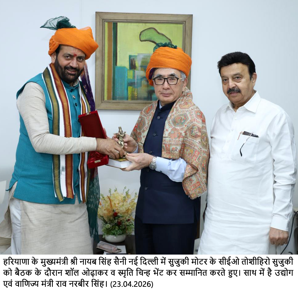 चंडीगढ़, 23 अप्रैल। हरियाणा के मुख्यमंत्री नायब सिंह सैनी से गुरुवार को नई दिल्ली स्थित हरियाणा भवन में सुजुकी मोटर के सीईओ तोशीहिरो सुजुकी ने मुलाकात की। इस दौरान सीईओ तोशीहिरो सुजुकी ने मुख्यमंत्री नायब सिंह सैनी से वायदा किया कि सुजुकी मोटर भविष्य में भी हरियाणा के अंदर और निवेश करेगी। उन्होंने कहा कि भारत की प्रोग्रेस के साथ-साथ हरियाणा की प्रोग्रेस में भी उनकी कंपनी पूरा सहयोग करेगी। मुख्यमंत्री नायब सिंह सैनी ने कहा कि जापान और हरियाणा के बीच सांस्कृतिक सहयोग के लिए जापान में अंतरराष्ट्रीय गीता जयंती महोत्सव आयोजित किया जाएगा। उन्होंने 20 जून को टोक्यो विश्वविद्यालय में अंतरराष्ट्रीय गीता सेमिनार में विशिष्ट अतिथि के रूप में आने के लिए सुजुकी के सीईओ तोशीहिरो सुजुकी को न्यौता भी दिया।
