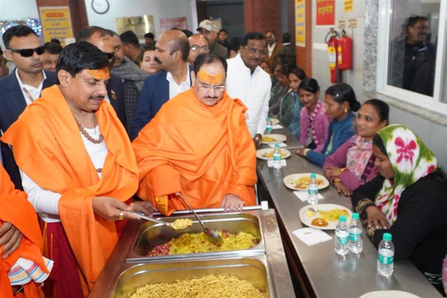 नड्डा और डॉ यादव ने अन्न क्षेत्र में प्रसाद किया वितरित, खुद भी ग्रहण किया
